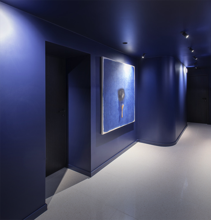 Unwind in calming blue tones and curated artwork. Your preparation space to ease the transition from daily life to meditation.